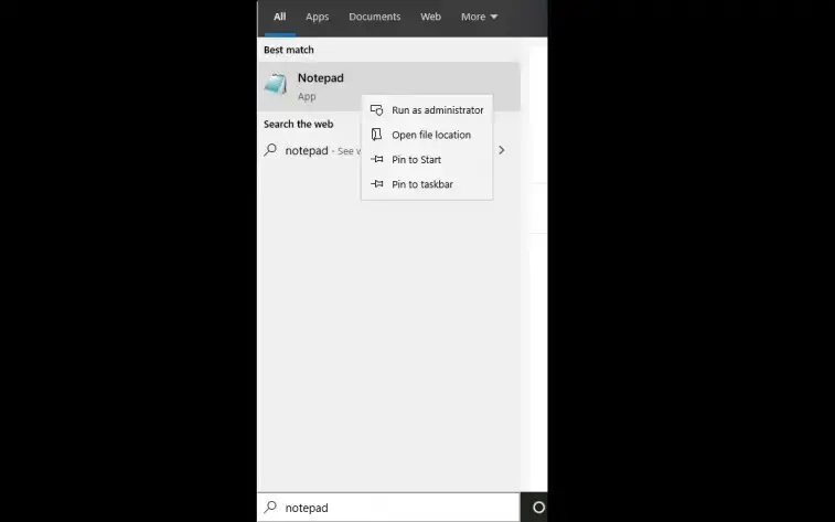 You can use the search function to open Notepad using administrator privileges. All you need to do is type in Notepad, then right-click on the icon, and choose the first option, "Run as administrator." Now, you will have the privileges in Notepad that you need in order to add your text.